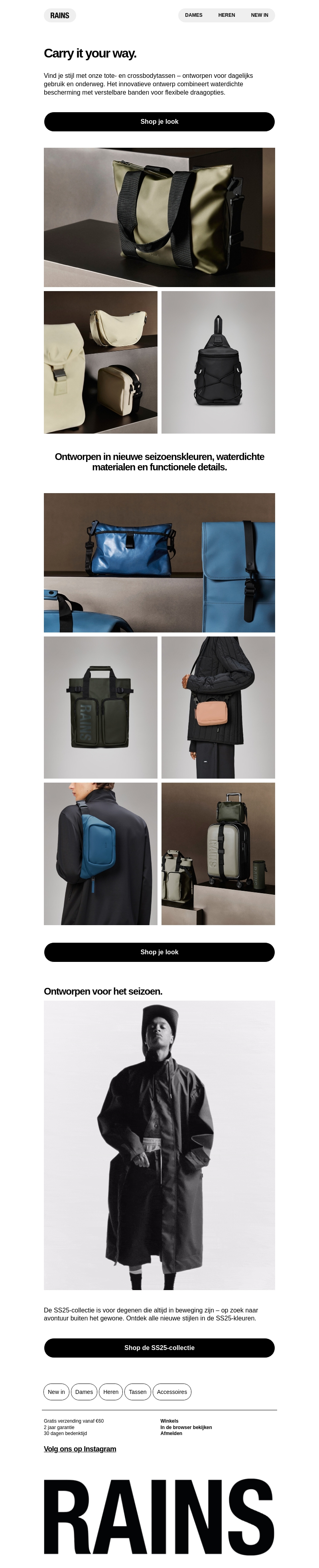 Ontdek de nieuwste tassen van RAINS, speciaal ontworpen voor dagelijks gebruik en avonturen onderweg. Deze collectie biedt innovatieve ontwerpen met waterdichte bescherming en flexibele draagopties. Verkrijgbaar in moderne seizoenskleuren en functionele details. Perfect voor iedereen die stijlvol op pad wil gaan. Bekijk de SS25-collectie voor meer inspiratie.