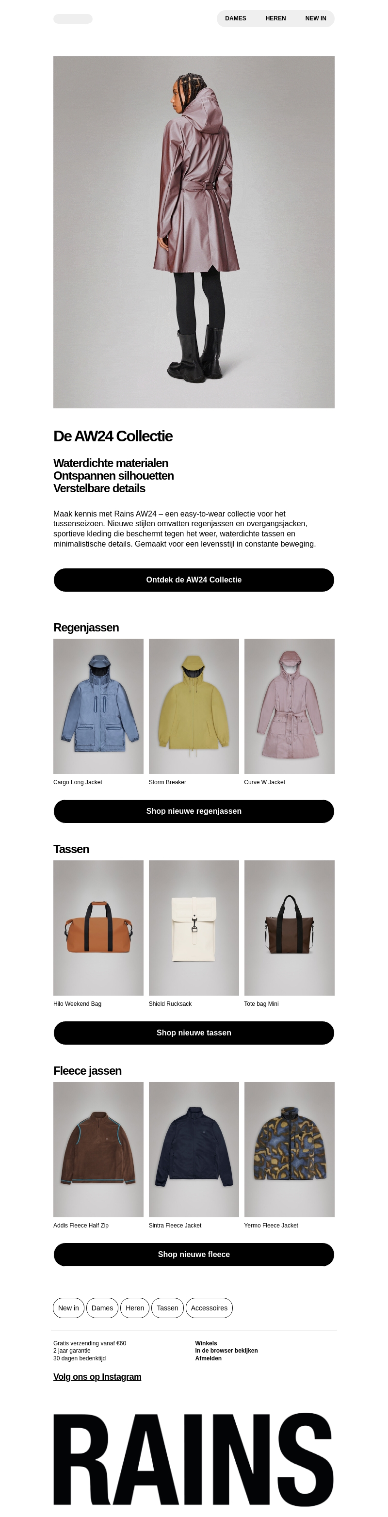 Maak kennis met de Rains AW24 collectie, ontworpen voor het tussenseizoen. Van stijlvolle regenjassen en waterdichte tassen tot warme fleece jassen, deze collectie biedt alles wat je nodig hebt voor een actief leven in elk weer.