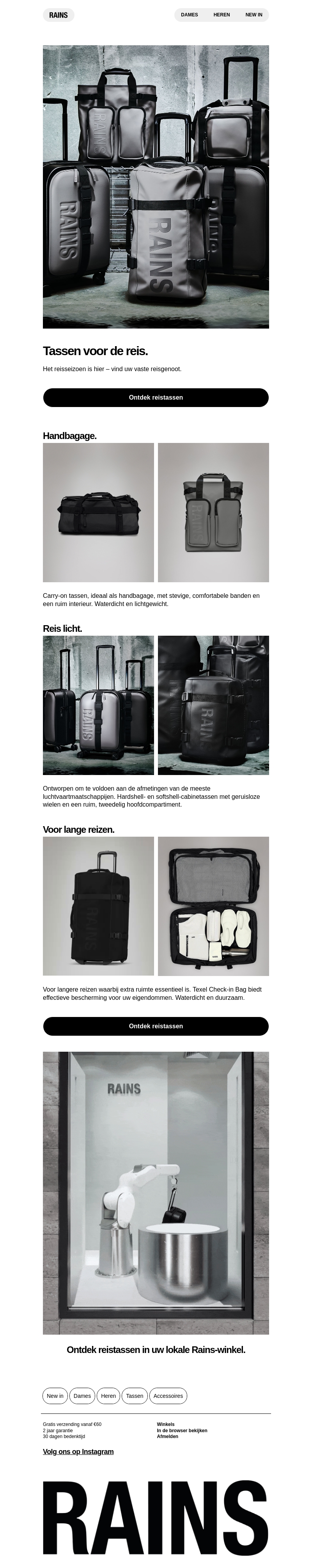 Ontdek de nieuwste reistassen van Rains, speciaal ontworpen voor zowel korte trips als lange reizen. Met handige eigenschappen zoals waterdicht materiaal en lichtgewicht ontwerp, zijn deze tassen een essentiële metgezel. Bekijk de handbaggage-opties en stevige check-in bags voor al uw reismomenten.