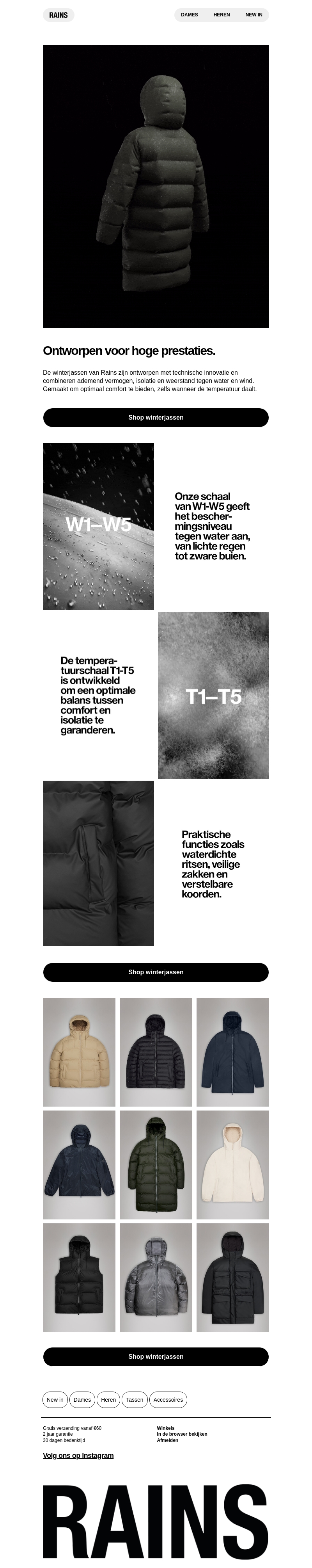 De winterjassen van Rains zijn ontworpen met geavanceerde technologie om optimale bescherming te bieden tegen de elementen. Met waterdichte ritsen en veilige zakken kunt u vertrouwen op hun functionaliteit. Ontdek de W1-W5 en T1-T5 schalen, speciaal ontwikkeld om comfort en isolatie te waarborgen.