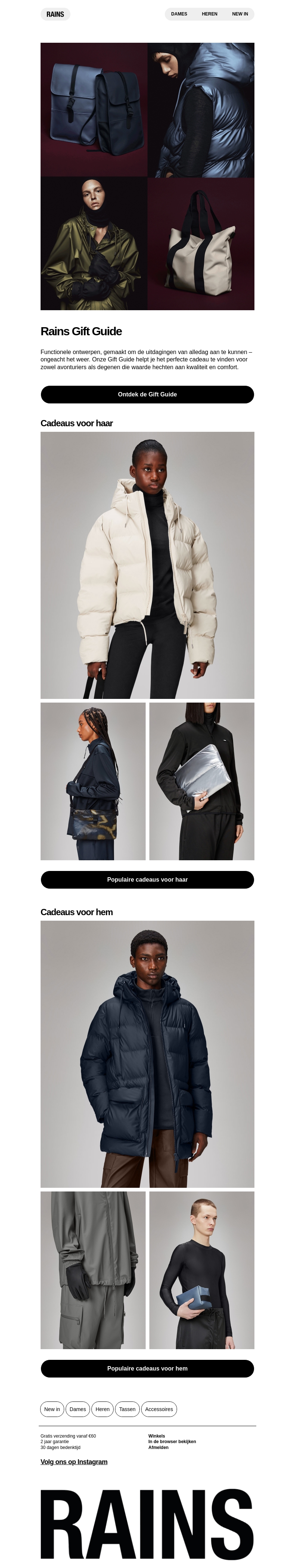 De Rains Gift Guide biedt een stijlvolle selectie van cadeaus voor zowel mannen als vrouwen. Ontdek functionele ontwerpen die perfect zijn voor dagelijks gebruik, ongeacht het weer. Of je nu zoekt naar een modieuze tas of een comfortabele jas, bij Rains vind je de ideale gift. Geef een cadeau dat avontuur en kwaliteit uitstraalt. Bekijk de populaire keuzes voor haar en hem. De perfecte gift voor elke gelegenheid.