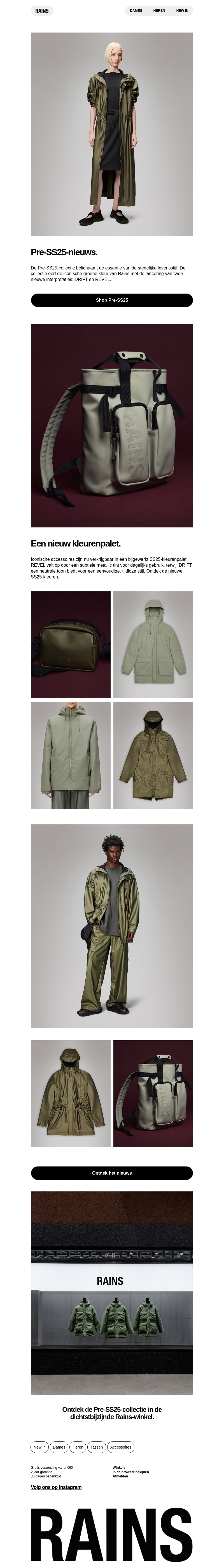 De Pre-SS25 collectie van RAINS biedt een nieuw kleurenpalet met unieke stijlen. Deze lijn is ontworpen om modieus en functioneel te zijn, ideaal voor het komende seizoen. Ontdek innovatieve jassen en accessoires die stijl en comfort combineren. Bezoek uw dichtstbijzijnde RAINS-winkel voor de nieuwste mode-essentials.