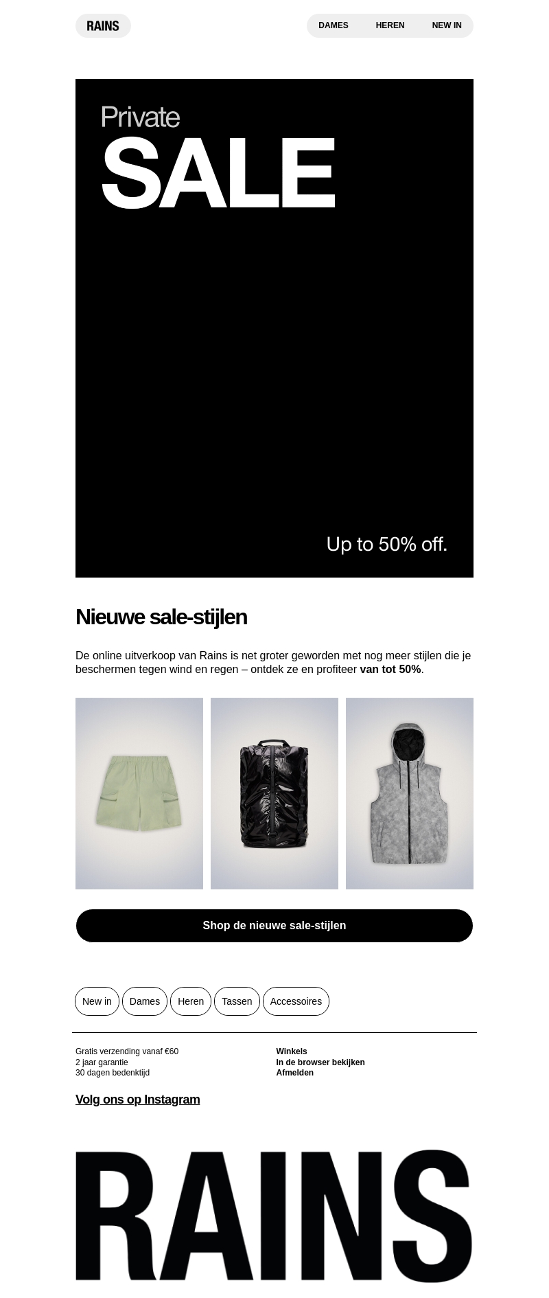 Geniet van de exclusieve privé uitverkoop bij Rains met nieuwe geselecteerde stijlen. Ontdek wind- en waterdichte kleding en accessoires met kortingen tot 50%. Shop de nieuwste sale-stijlen en maak gebruik van gratis verzending bij bestellingen vanaf €60.