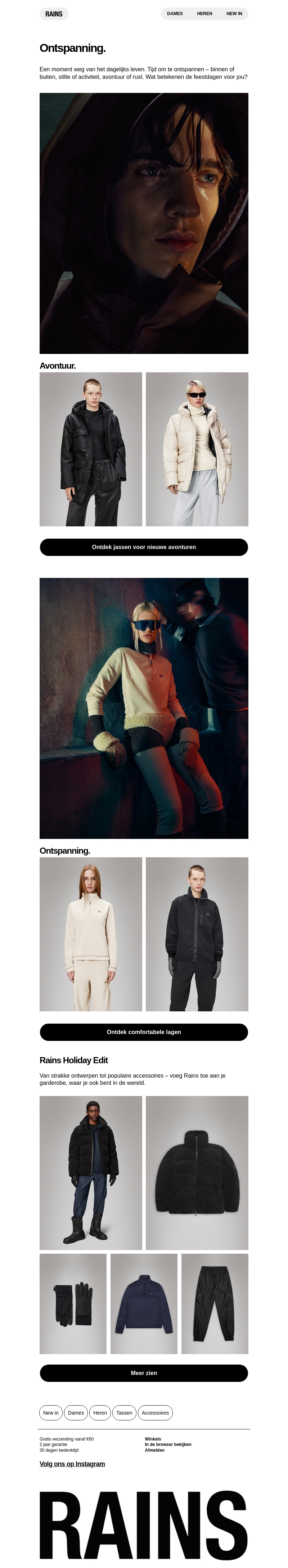 Rains presenteert de nieuwste collectie voor ultieme ontspanning. Vind stijlvolle jassen en comfortabele lagen voor binnen en buiten. Geniet van strakke ontwerpen en populaire accessoires. Perfect voor elk avontuur, ongeacht het weer.