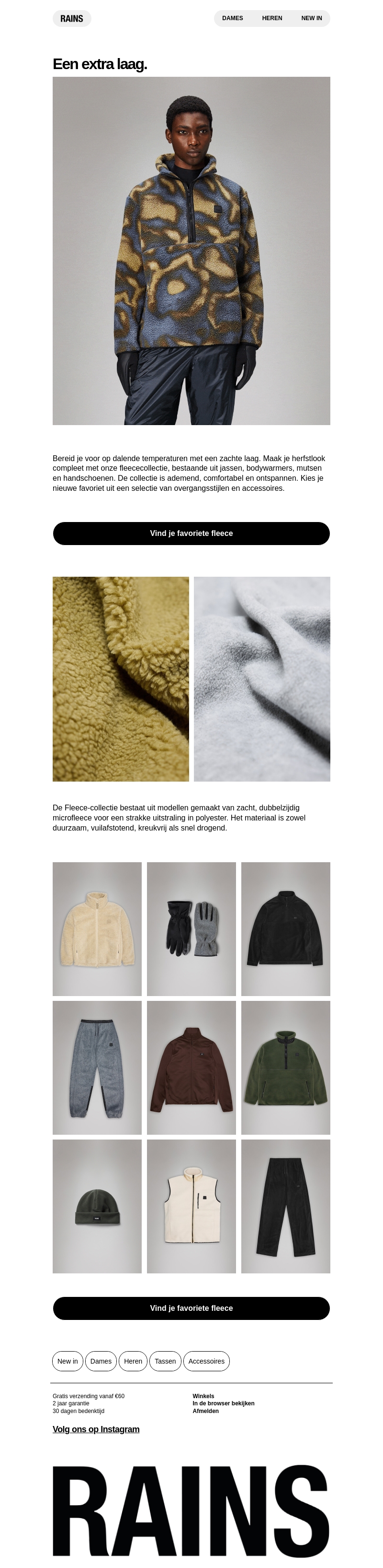 Maak je klaar voor koudere dagen met de nieuwste fleece collectie van Rains. Deze ademende en comfortabele kledingstukken zijn perfect om je herfstlook compleet te maken. Van jassen en bodywarmers tot mutsen en handschoenen, ontdek alles wat je nodig hebt om warm te blijven. De fleeces zijn gemaakt van duurzaam en snel drogend materiaal. Kies jouw favoriet uit een verscheidenheid aan stijlen en accessoires.