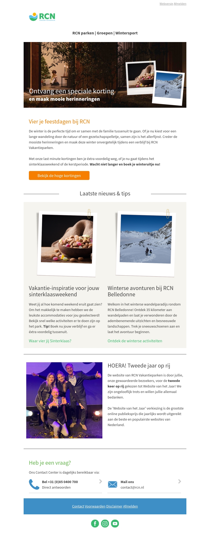 De winter is de ideale tijd om met familie te genieten bij RCN Vakantieparken. Maak mooie herinneringen en ontvang speciale kortingen voor je verblijf tijdens de sinterklaas- of kerstperiode. Ontdek onze unieke accommodaties en activiteiten voor een perfecte vakantie. Boek nu je winterplezier en profiteer van extra kortingen!