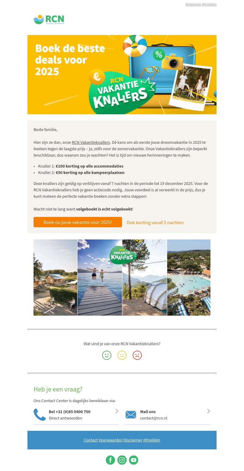 Mis de kans niet om jouw droomvakantie voor 2025 te boeken tegen de laagste prijs. RCN Vakantieknallers biedt nu €100 korting op alle accommodaties en €50 korting op alle kampeerplaatsen. Deze deals zijn geldig op verblijven vanaf 7 nachten tot 19 december 2025. Boek direct en verzeker je van een onvergetelijke vakantie zonder extra stappen.