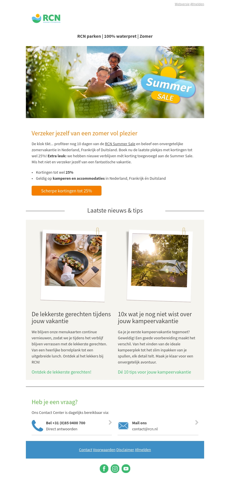 De klok tikt! Profiteer nog 10 dagen van de RCN Summer Sale en beleef een onvergetelijke zomervakantie in Nederland, Frankrijk of Duitsland. Boek nu de laatste plekjes met kortingen tot wel 25%! Geldig op kamperen en accommodaties. Ontdek onze nieuwe verblijven en scherpe kortingen.