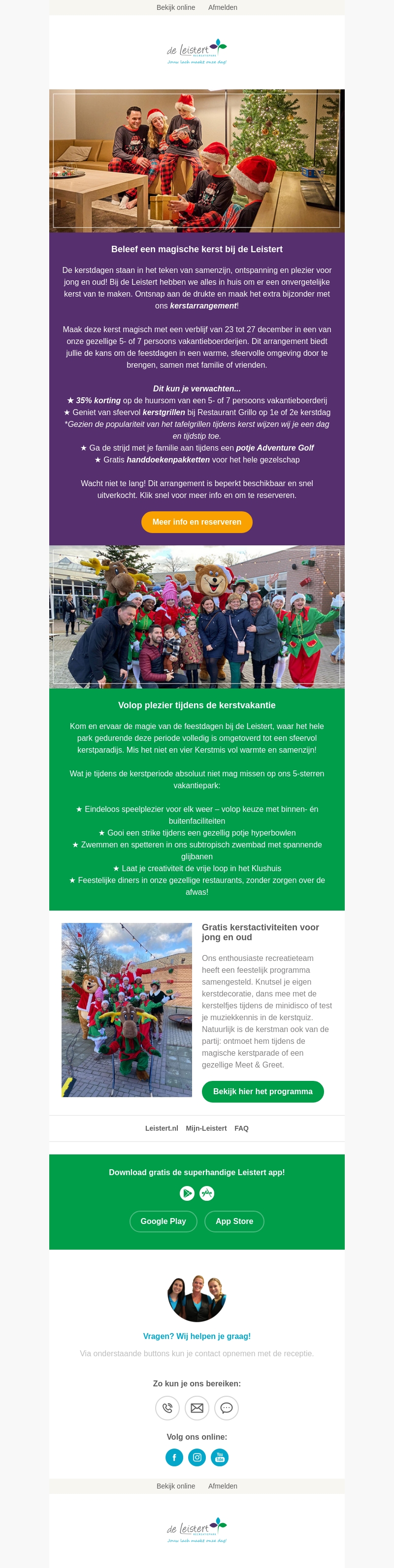 Geniet van een magische kerst bij de Leistert met ons speciale kerstarrangement. Verblijf in een comfortabele vakantiebungalow van 23 tot 27 december en profiteer van 35% korting. Maak plezier met activiteiten zoals adventure golf en kerstgrillen. Ervaar de feestelijke sfeer met eindeloze speelplezier en creatieve workshops.