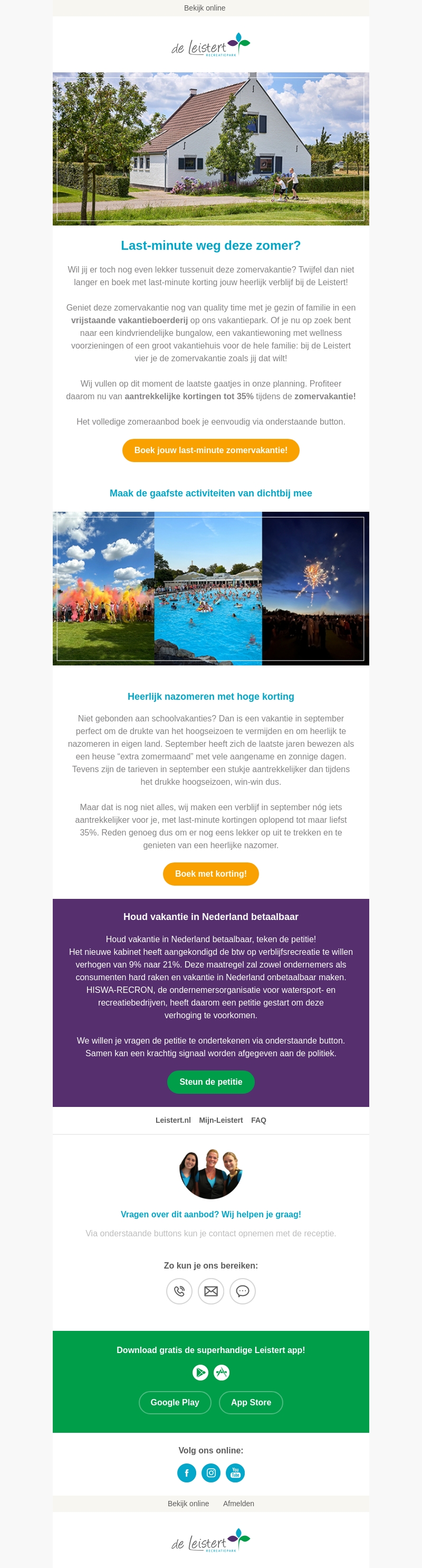 Wil je er nog even tussenuit deze zomer? Boek dan een last-minute vakantie bij de Leistert en geniet van aantrekkelijke kortingen tot 35%. Ontdek de gaafste activiteiten dichtbij en nazomer met hoge kortingen. Profiteer van de laatste beschikbare plaatsen en beleef een fantastische vakantie!
