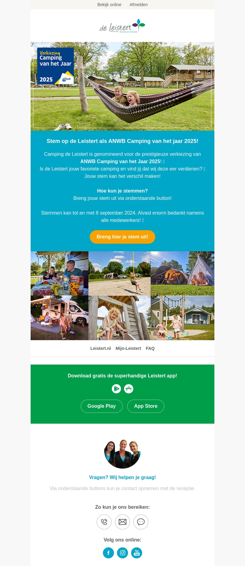 De Leistert is genomineerd voor de ANWB Camping van het Jaar 2025! Vind jij dat wij deze eer verdienen? Breng dan jouw stem uit en help ons deze prestigieuze titel te winnen. Stemmen kan tot en met 8 september 2024. Wij waarderen je steun enorm!