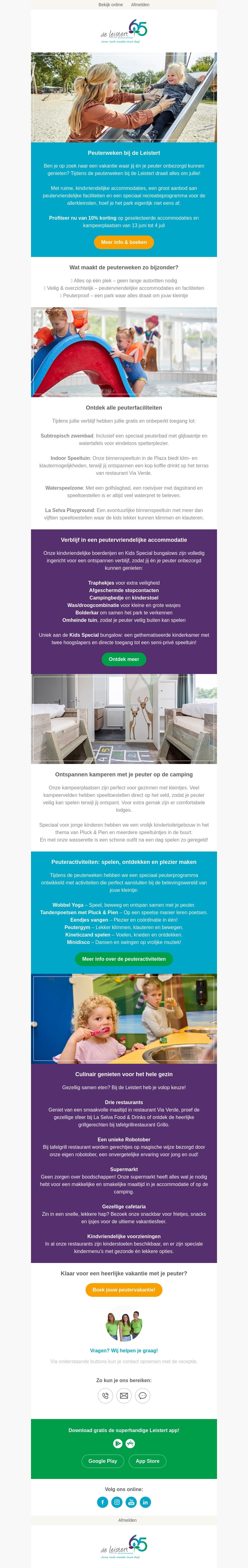 Bij de Leistert staan de Peuterweken voor de deur, met een scala aan activiteiten speciaal voor de allerkleinsten. Van speciale peuterfaciliteiten tot ontspannen indoor spelen, er is voor ieder wat wils. Profiteer van 10% korting op geselecteerde accommodaties. Boek nu jouw ideale peutervakantie en ontdek al het leuks dat de Leistert te bieden heeft. Maak van deze vakantie een bijzondere ervaring voor het hele gezin.
