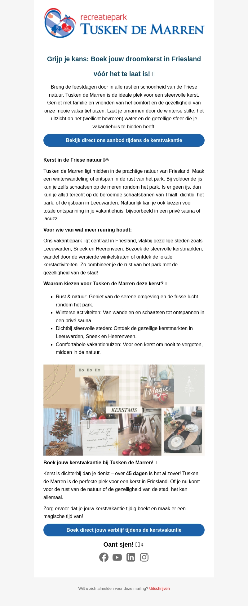 Ontsnap naar de rust van Friesland voor een sfeervolle kerst. Tusken de Marren biedt comfortabele vakantiehuizen te midden van de Friese natuur. Geniet van winterse activiteiten of ontdek gezellige steden in de buurt. Reserveer nu je kerstvakantie en beleef een onvergetelijke tijd.