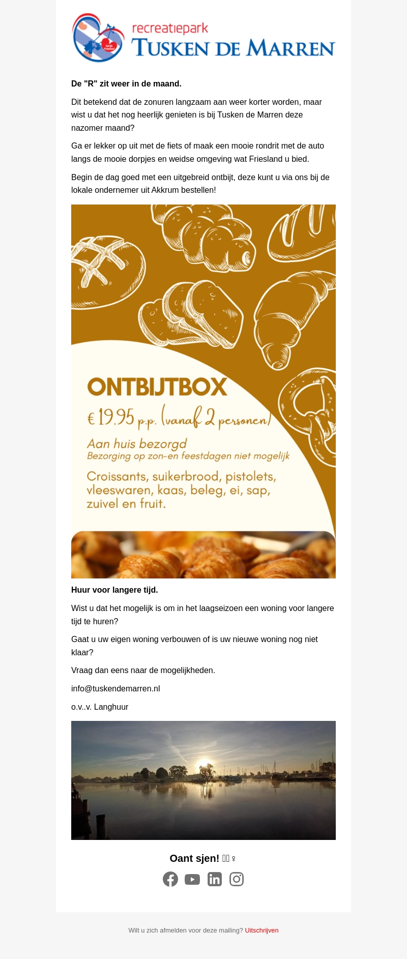 Geniet van de nazomermaand bij recreatiepark Tusken de Marren. Ontdek de omgeving per fiets of auto en begin je dag met een uitgebreid ontbijt. Wij bieden ook mogelijkheden voor langdurige huur tijdens het laagseizoen.