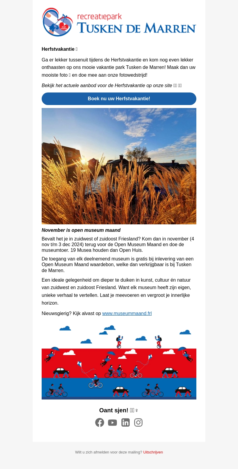Beleef een ontspannen Herfstvakantie bij recreatiepark Tusken de Marren. Geniet van de natuur en neem deel aan onze fotowedstrijd. In november opent de Open Museum Maand in Friesland met gratis toegang tot 19 musea. Ontdek kunst, cultuur en natuur zoals nooit tevoren.