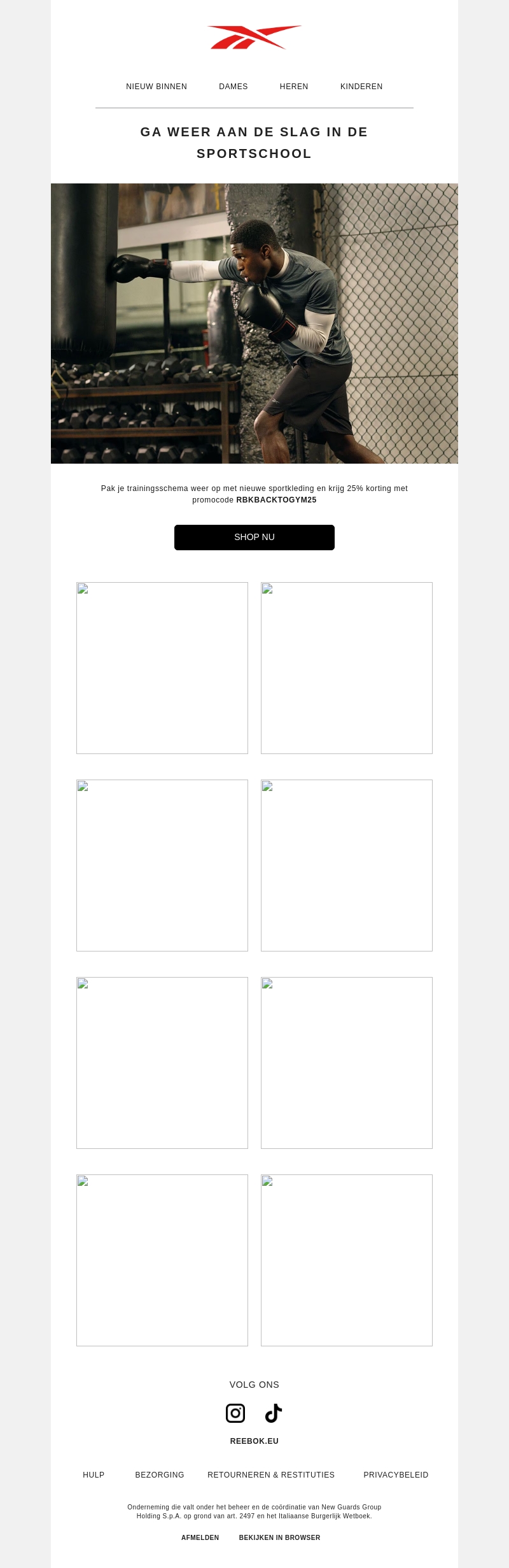 Ga weer aan de slag in de sportschool met Reebok! Ontdek de nieuwste sportkleding en krijg 25% korting met de promocode RBKBACKTOGYM25. Profiteer nu van deze geweldige aanbieding en verbeter je workout met stijlvolle en functionele outfits. Shop de collectie nu op Reebok.eu.