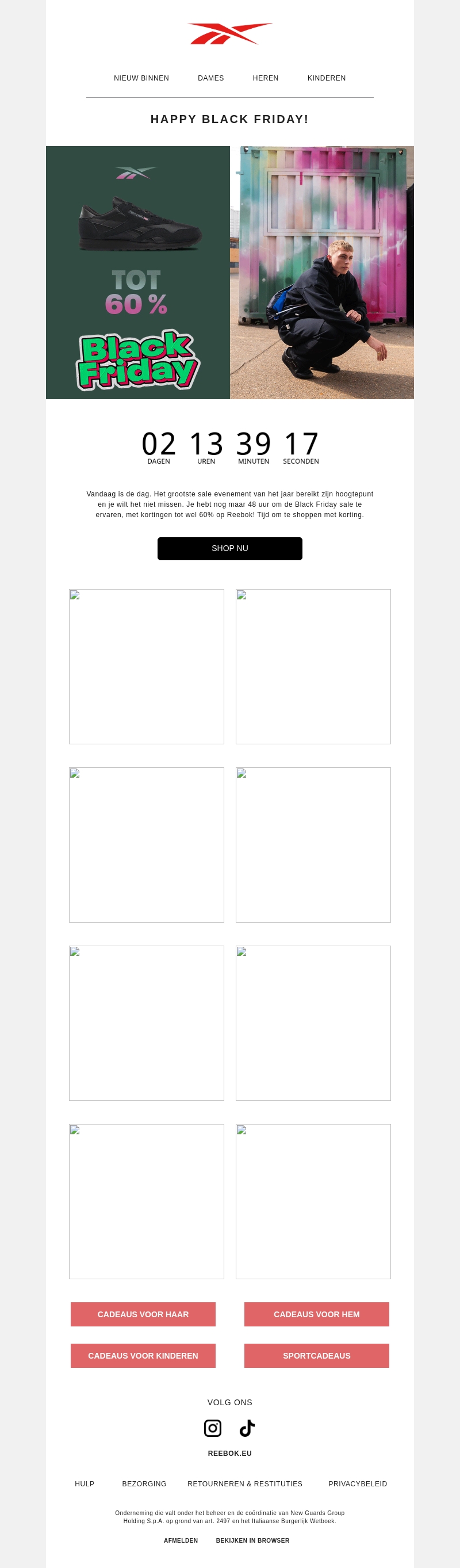 Vier Black Friday met Reebok en profiteer van kortingen tot wel 60%! Deze unieke sale loopt slechts 48 uur en biedt fantastische deals op een breed assortiment. Grijp je kans om te shoppen met de grootste kortingen van het jaar. Perfect voor jezelf of als cadeau. Bezoek nu de website en mis deze buitenkans niet.