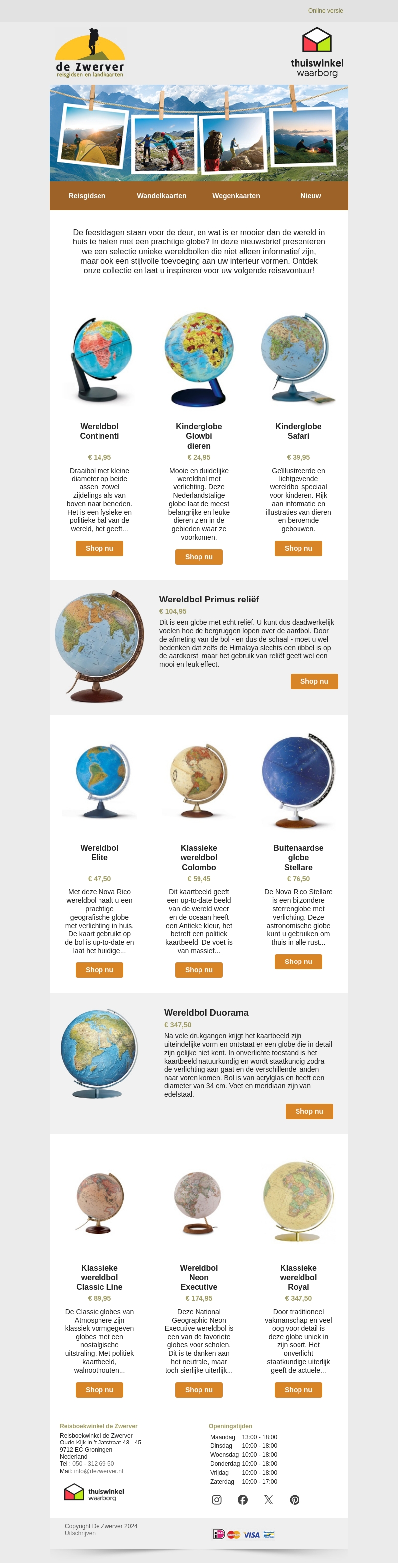 De feestdagen komen eraan, en wat is er mooier dan de wereld bij je thuis te halen met een prachtige globe? In deze nieuwsbrief presenteren we unieke wereldbollen die niet alleen informatief zijn, maar ook stijlvol bijdragen aan je interieur. Ontdek ons uitgebreide aanbod en kies jouw favoriet voor het komende avontuur.