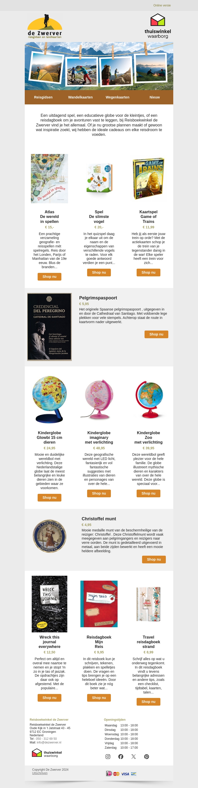 Bij Reisboekwinkel de Zwerver vind je alles voor globetrotters en ontdekkingsreizigers. Van uitdagende spellen en kinderglobes met verlichting tot reisdagboeken om je avonturen vast te leggen. Ontdek ons zorgvuldig geselecteerde assortiment reis- en wandelkaarten, pelgrimspaspoorten, en alles voor de avontuurlijke geest.