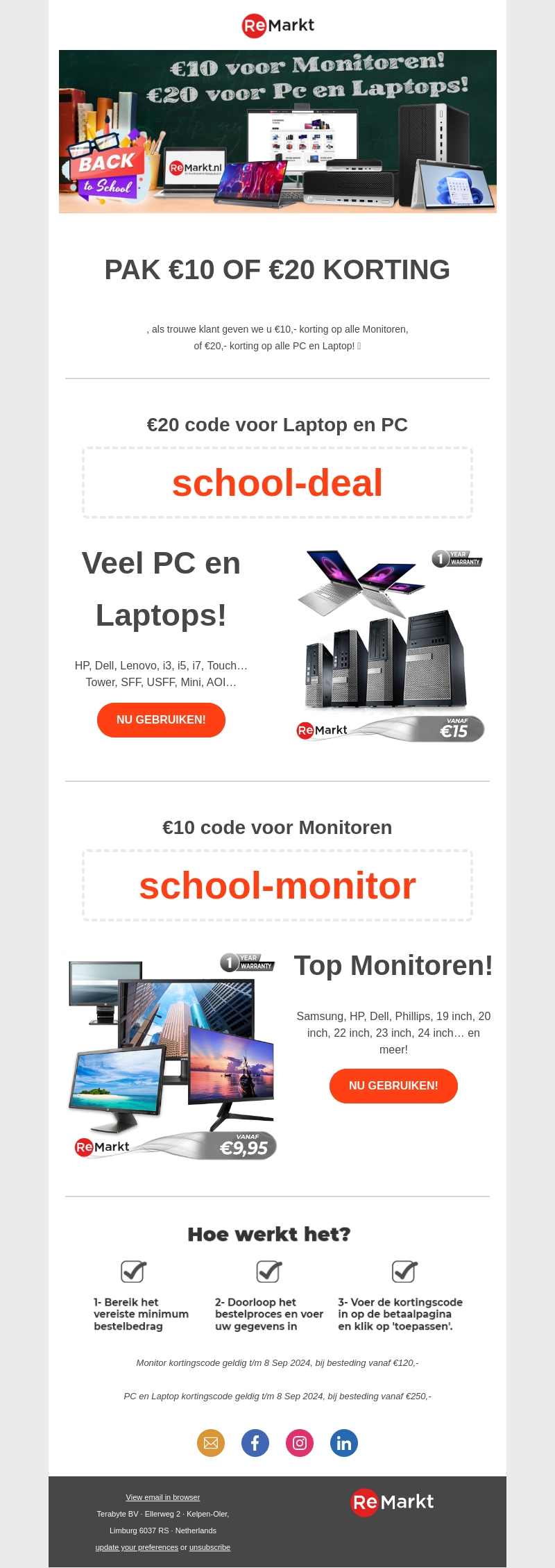 Onze Back to School-aanbiedingen zijn bijna voorbij. Ontvang €10 korting op monitoren en €20 korting op PC's en laptops als trouwe klant. Mis deze kans niet om te besparen op topmerken zoals HP, Dell, Lenovo en meer. Geldig tot 8 september 2024.