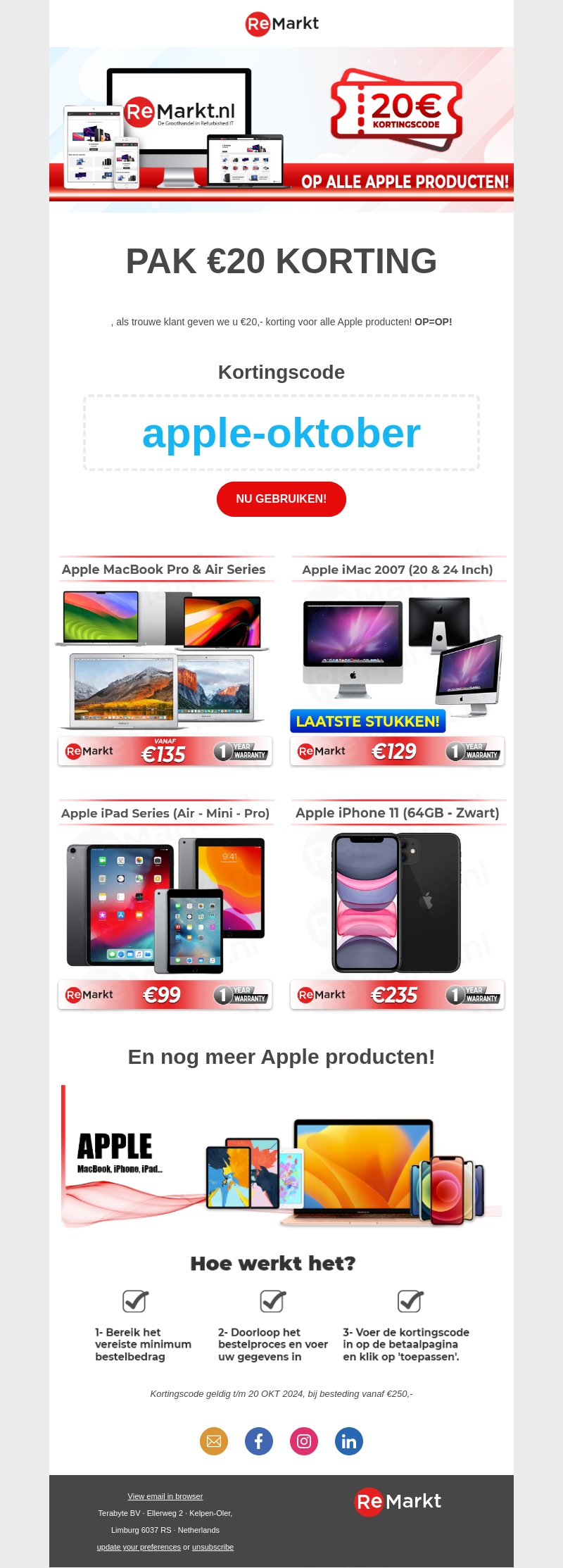 Mis deze kans niet om te besparen op Apple producten bij ReMarkt. Ontvang €20 korting bij uw aankoop door de kortingscode 'apple-oktober' te gebruiken. Grijp uw favoriete Apple producten zoals MacBooks, iMacs, iPads, en iPhones met deze geweldige aanbieding. De korting is geldig tot 20 oktober 2024. Zorg ervoor dat u snel bent, want op = op!
