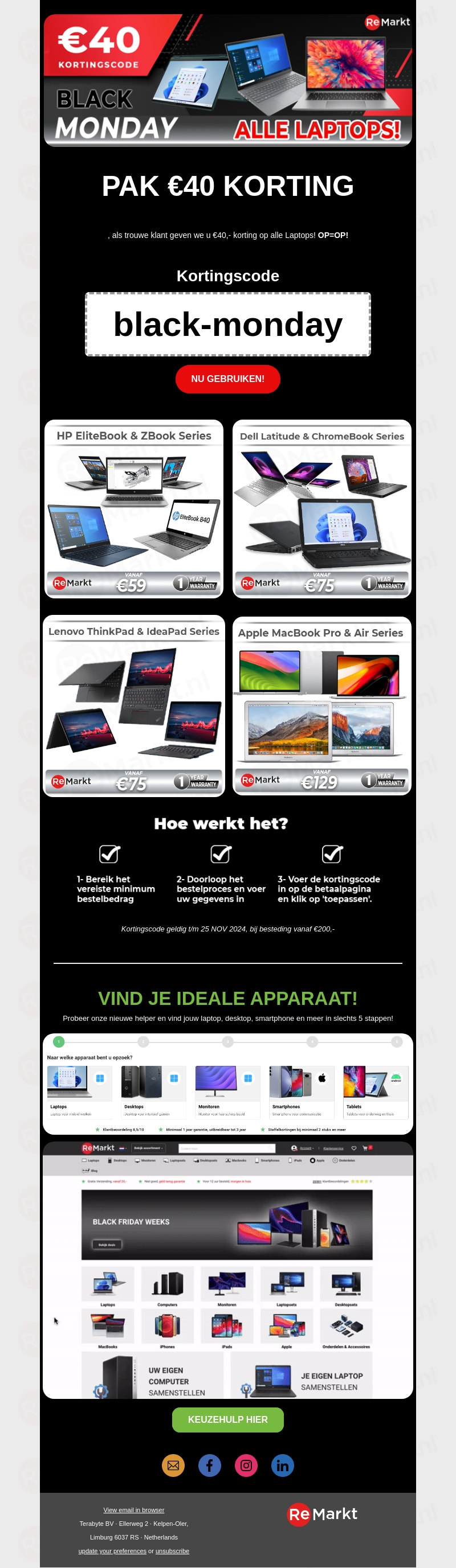 Vier Black Monday met een fantastische aanbieding: €40 korting op alle laptops. Ontdek topmodellen van HP, Dell, Lenovo en Apple tegen gereduceerde prijzen. Plaats snel je bestelling, want op is op! Gebruik de kortingscode 'black-monday' en maak gebruik van de extra besparing. Deze actie loopt tot 25 november 2024.