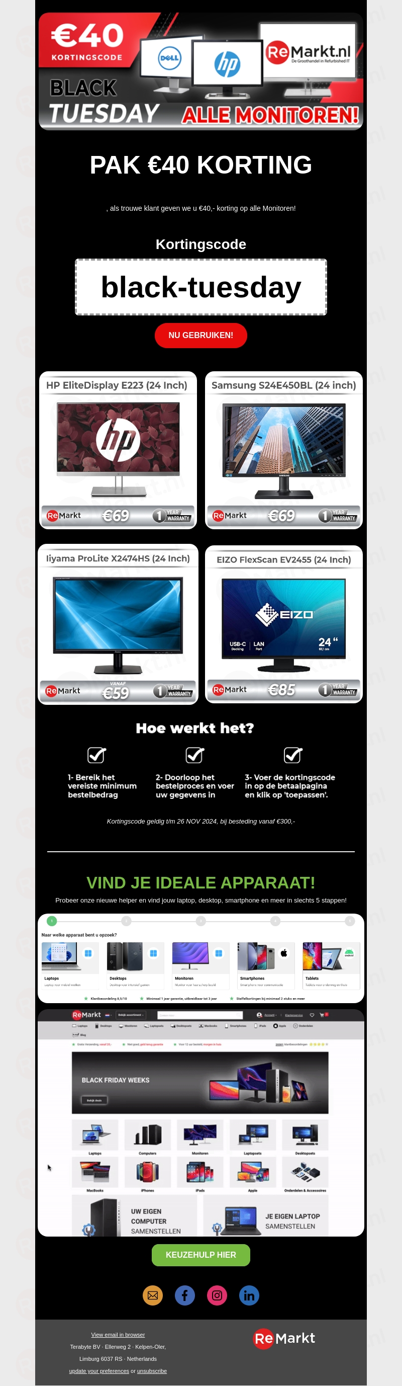 Geniet van spectaculaire aanbiedingen op monitoren tijdens onze Black Tuesday actie. Ontvang β¬40 korting met de kortingscode 'black-tuesday' op alle monitoren. Of je nu op zoek bent naar een HP, Samsung, Iiyama of EIZO, je vindt het bij ReMarkt voor een scherpe prijs. De actie is geldig tot 26 november 2024, bij een minimale besteding van β¬300. Mis deze kans niet en upgrade je apparatuur voor minder!