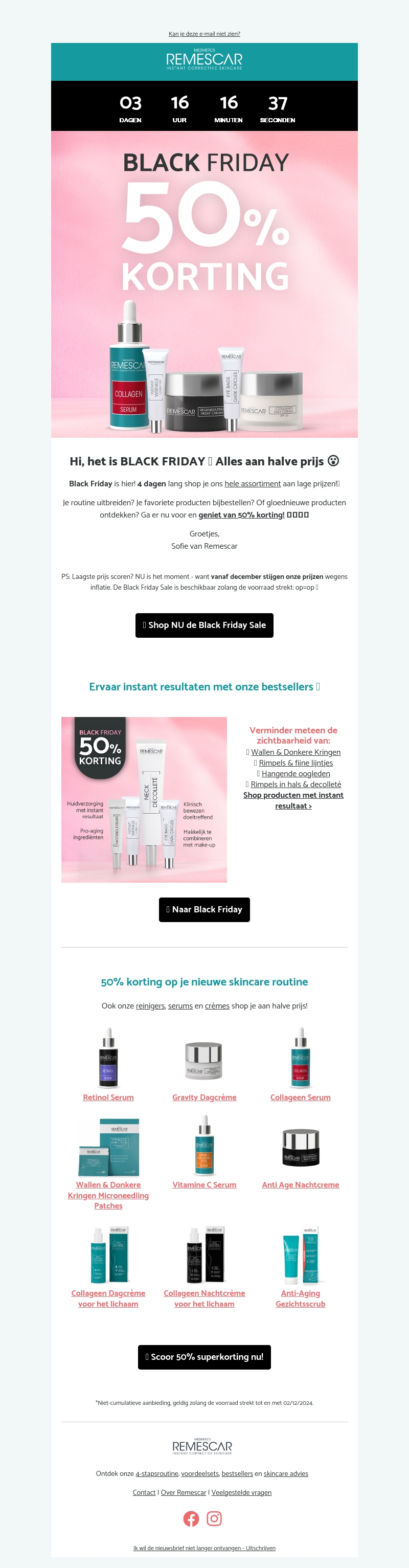 Black Friday is hier en Remescar biedt maar liefst 50% korting op hun hele assortiment! Breid je huidverzorgingsroutine uit of ontdek nieuwe favorieten met deze geweldige kortingen. Wees er snel bij, want van af december stijgen de prijzen vanwege inflatie. De actie geldt zolang de voorraad strekt, dus shop nu!
