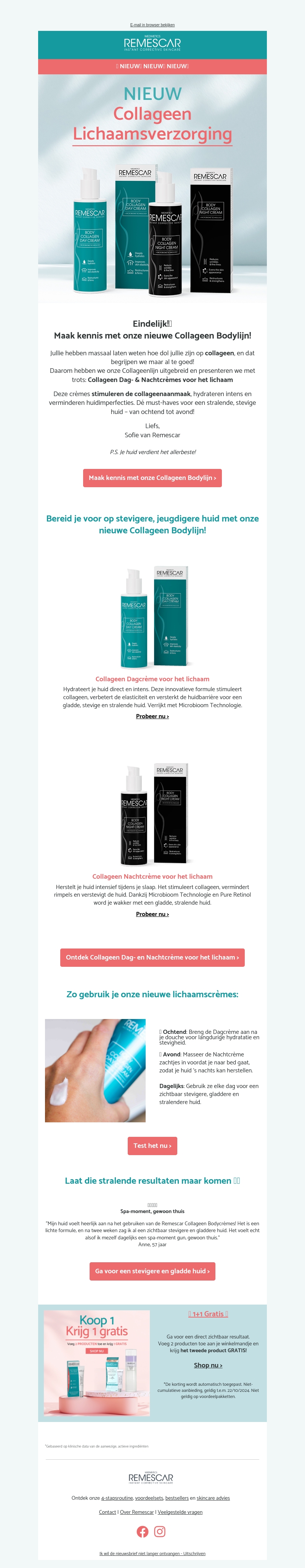 Maak kennis met de nieuwste Collageen Lichaamsverzorging van Remescar. Deze lijn biedt hydraterende dag- en nachtcrèmes voor een stevige en gladde huid. De formules stimuleren collageen en verminderen huidimperfecties. Profiteer van onze introductieaanbieding: koop er één, krijg er één gratis! Ontdek nu de voordelen van een stralende huid met onze producten.