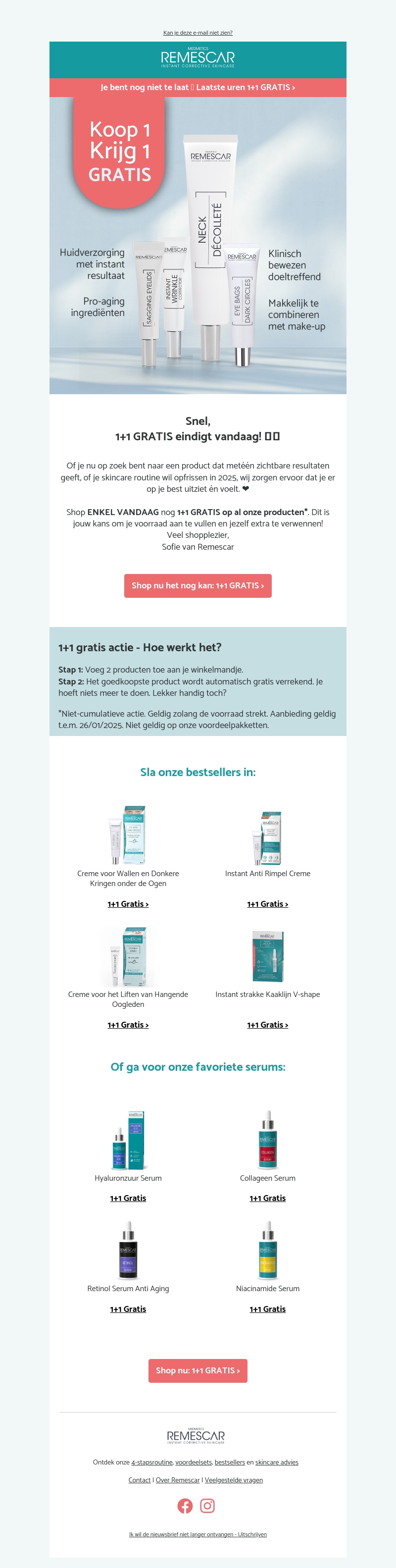 Profiteer van de laatste uren van de 1+1 gratis actie op geselecteerde Remescar producten. Deze aanbieding is ideaal om je huidverzorgingsroutine te vernieuwen met pro-aging formules en instant resultaten. Actie geldig tot 26/01/2025 of zolang de voorraad strekt. Voeg twee producten toe aan je winkelmandje en ontvang de voordeligste gratis. Mis deze unieke kans niet!