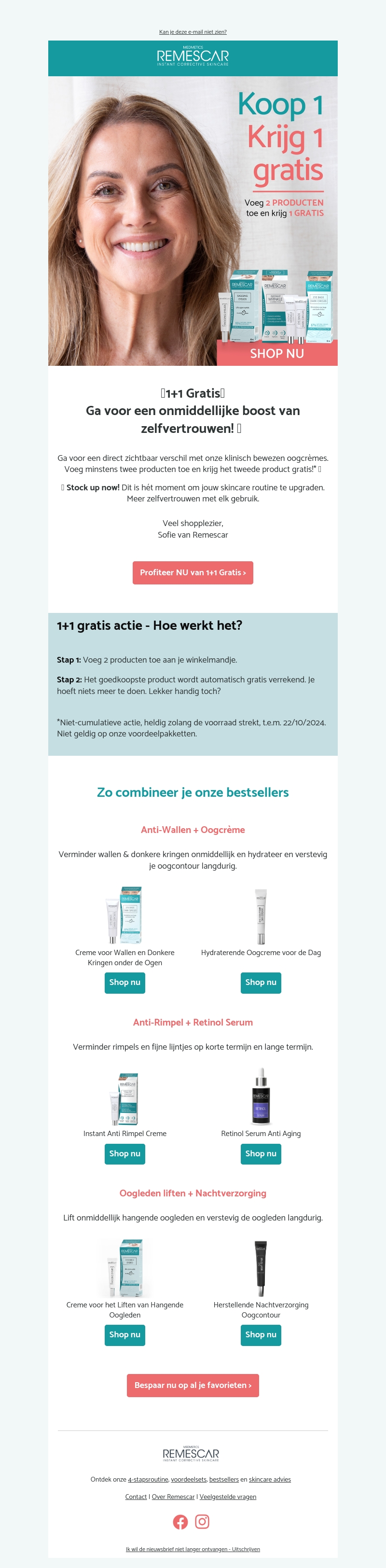Profiteer nu van de 1+1 gratis actie en verwen jezelf met klinisch bewezen huidverzorgingsproducten. Vul je winkelmand met twee items en ontvang het goedkoopste gratis. Upgrade je skincare routine met bewezen resultaten. Geldig tot 22/10/2024.