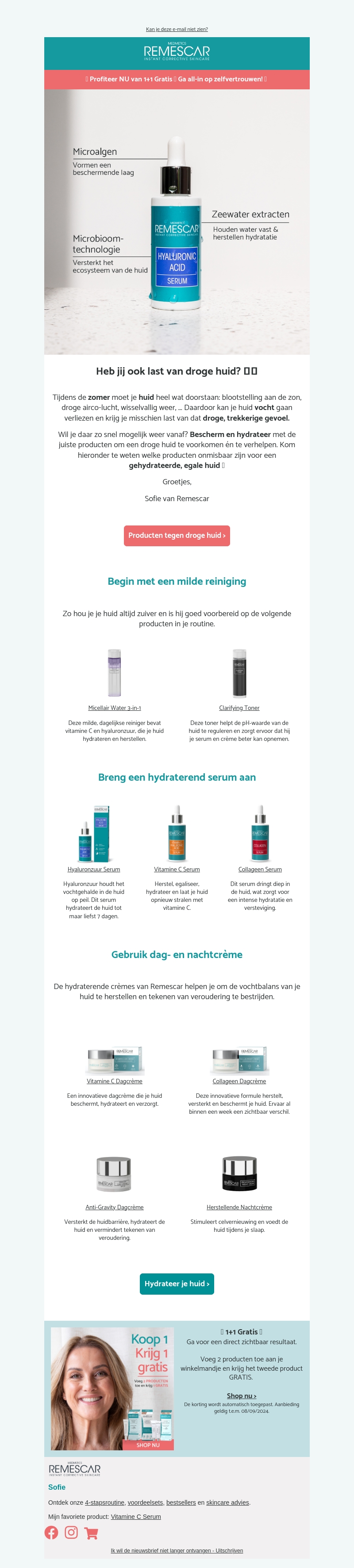 Heb jij last van een droge huid? Ontdek nu de producten van Remescar om je huid te beschermen en te hydrateren. Profiteer nu van de 1+1 gratis aanbieding op geselecteerde producten en geef je huid de zorg die het nodig heeft.