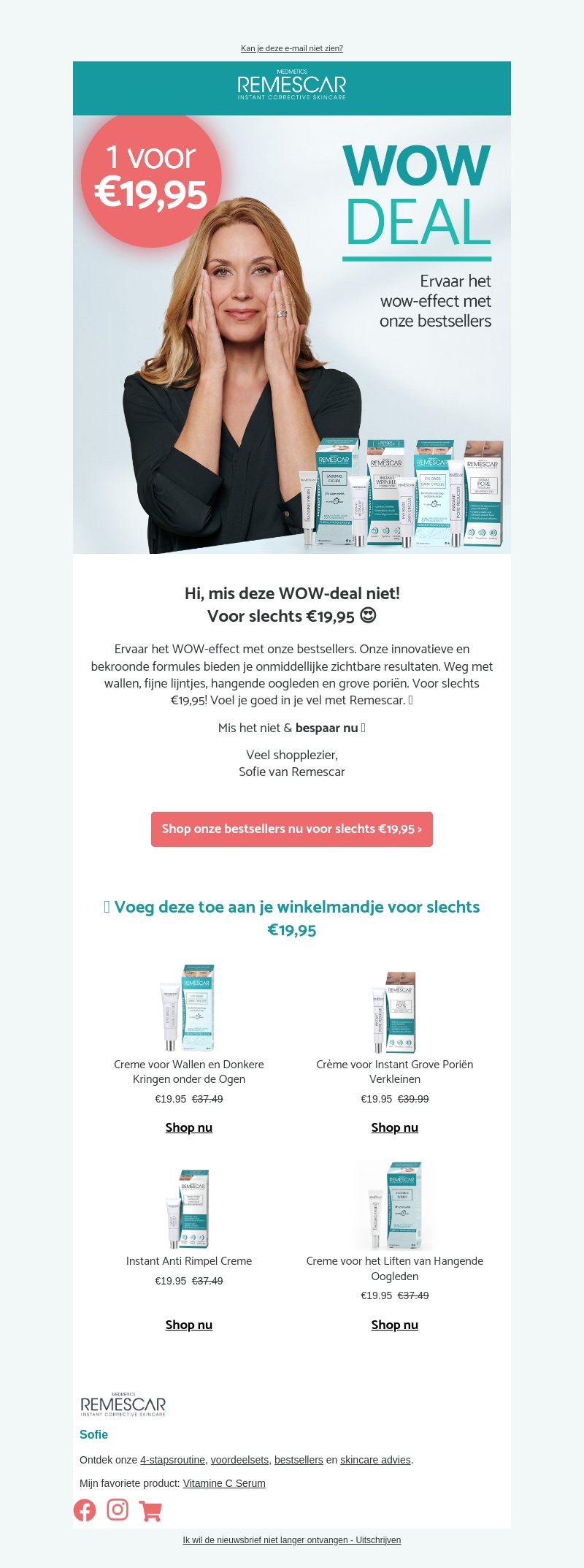 Ervaar het WOW-effect met de bekroonde formules van Remescar. Bespaar nu en ontvang onze producten voor slechts β¬19,95. Verwijder wallen, fijne lijntjes en grove poriΓ«n in een mum van tijd. Voel je goed in je vel met Remescar's premium skincare producten. Mis deze deal niet!
