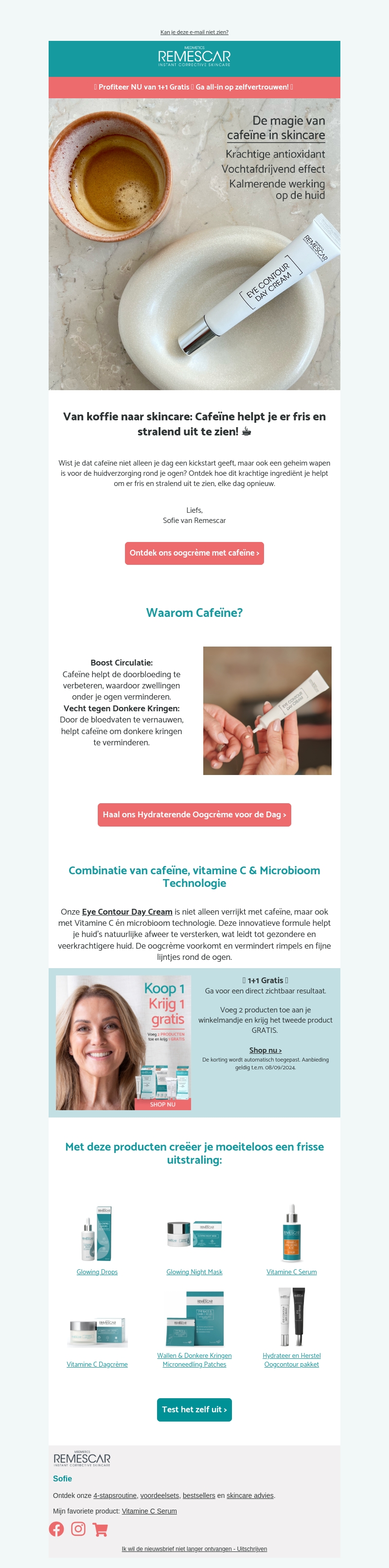 Cafeïne is niet alleen goed voor je ochtendkick, maar ook voor je huid! Ontdek hoe cafeïnehoudende producten je kunnen helpen om een frisse en stralende uitstraling te behouden. Van betere doorbloeding tot het verminderen van donkere kringen, de magie van cafeïne doet het allemaal. Probeer nu onze Eye Contour Day Cream met 1+1 gratis aanbieding.