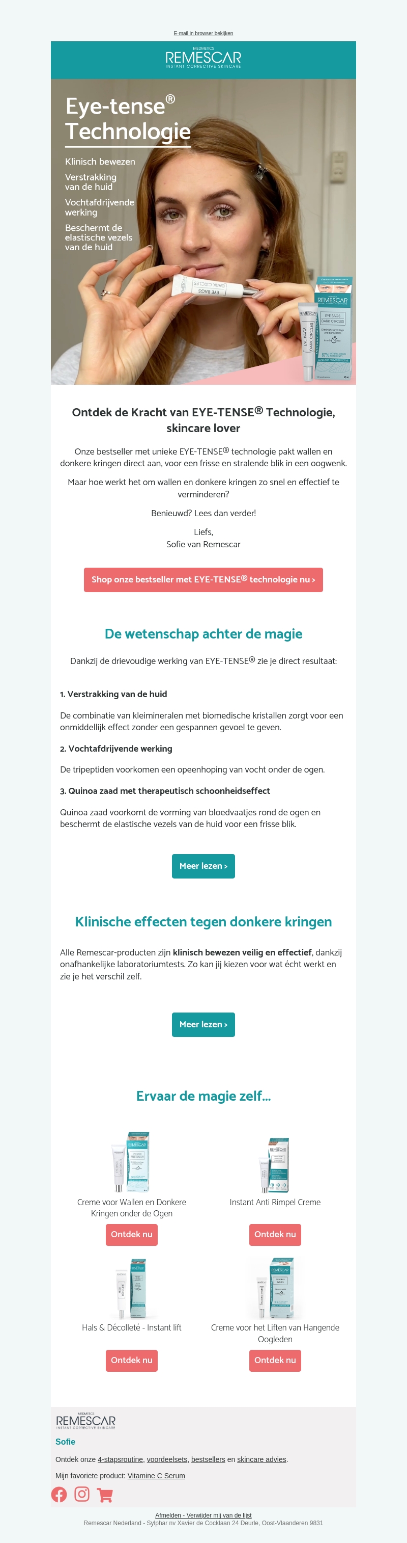 Ontdek de unieke EYE-TENSE® technologie van Remescar die direct wallen en donkere kringen vermindert. Lees meer over de klinische resultaten en de drievoudige werking van onze bestsellers. Ervaar de magie zelf met onze effectieve producten.