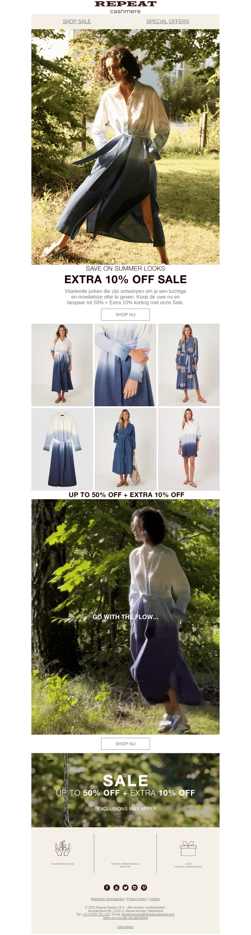 Mis de kans niet om te besparen op elegante zomeroutfits. Onze sale biedt tot 50% korting en een extra 10% korting bovenop. Ontdek luchtige en moeiteloze jurken die perfect zijn voor elke gelegenheid deze herfst. Shop nu en geniet van gratis verzending en luxe cadeauverpakking. Kijk snel en vernieuw je garderobe.