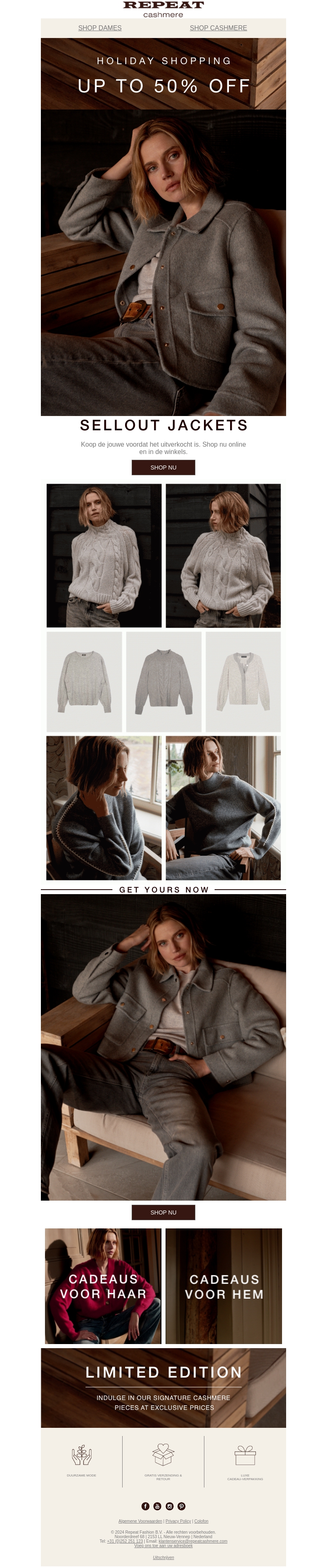 Profiteer van onze laatste minuut aanbiedingen met tot wel 50% korting op selecte cashmere stukken. Perfecte cadeaus voor haar en hem. Bekijk onze limited edition collectie en sla je slag voordat alles weg is. Shop nu online en in de winkels.