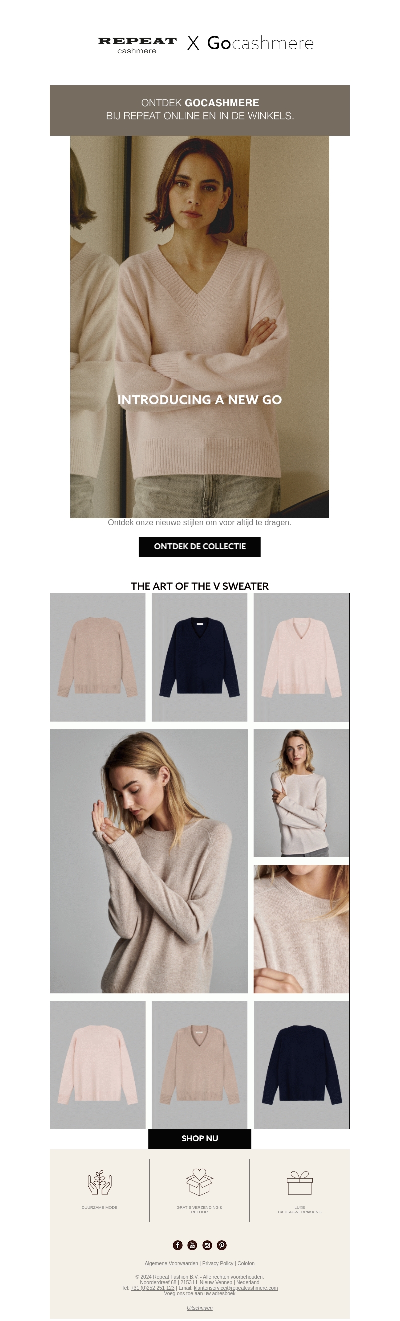 Ontdek de nieuwe GoCashmere collectie nu beschikbaar bij Repeat. Onze nieuwste collectie biedt stijlvolle en comfortabele truien die perfect zijn voor elke gelegenheid. Shop nu en ervaar de luxe van cashmere. Gratis verzending en retour.