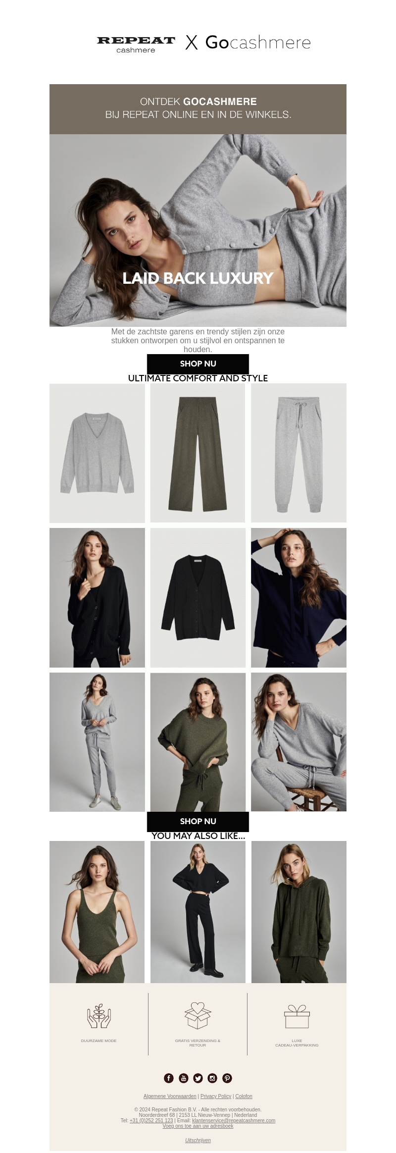 De nieuwe collectie van Gocashmere is nu beschikbaar bij Repeat Fashion. Ontdek de perfecte balans tussen luxe en comfort met onze hoogwaardige kledingstukken. Van zachte truien tot stijlvolle broeken, elk item is ontworpen om u stijlvol en ontspannen te houden. Shop nu en ervaar de laid-back luxe van Gocashmere.