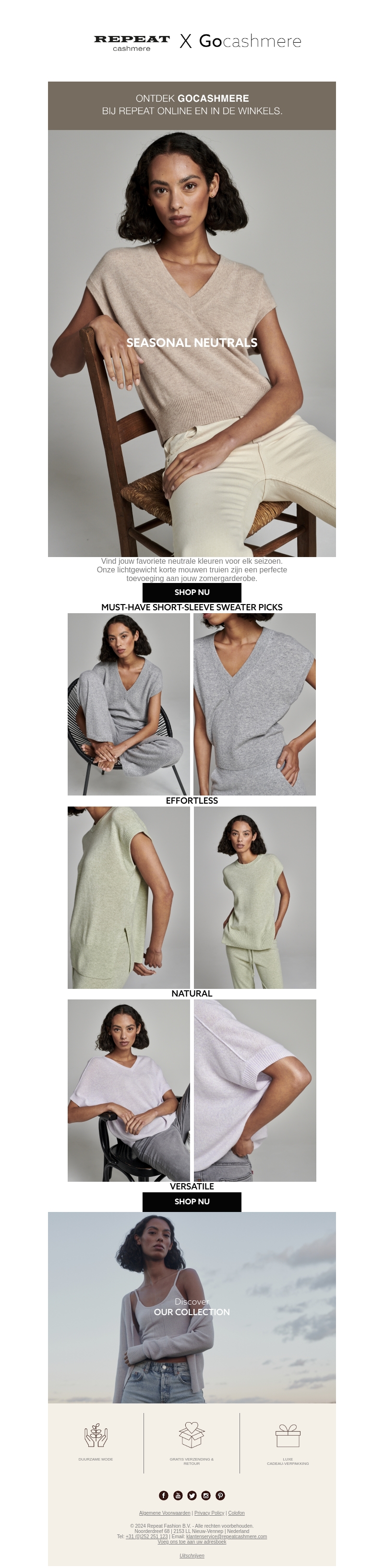 Ontdek de nieuwste collectie seizoensgebonden neutrale kleuren van Gocashmere bij Repeat. Deze lichtgewicht korte mouwen truien zijn perfect voor de zomer. Verken onze must-have picks en vind je favoriete stijl. Shop nu online of in de winkels.