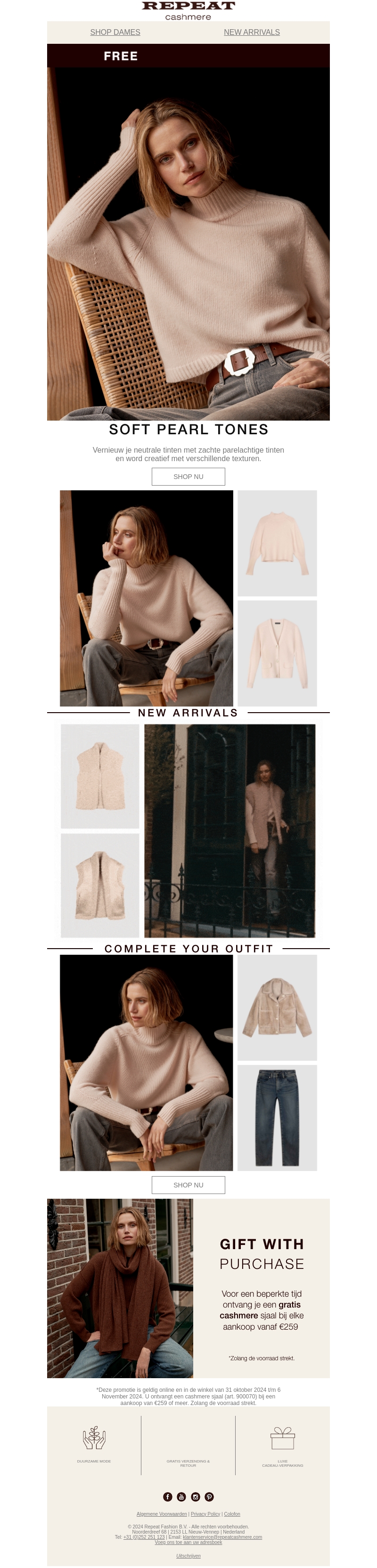 Ontdek onze nieuwste collectie in zachte pareltinten en vernieuw je garderobe. Bij een aankoop van €259 ontvang je tijdelijk een gratis cashmere sjaal. Combineer stijlvol met onze selectie en maak je outfit compleet. Profiteer van onze exclusieve aanbieding en geef je look een luxe touch. Alleen geldig tot 6 november 2024.