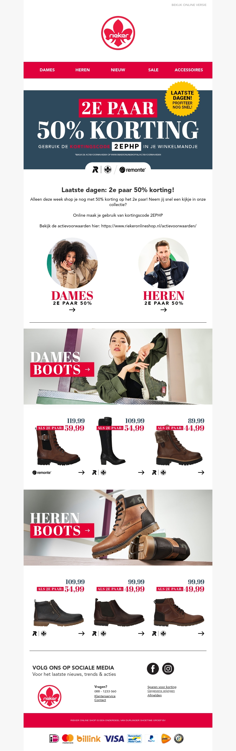 Mis deze kans niet om je schoenenkast aan te vullen met een geweldige aanbieding: koop deze week je tweede paar schoenen met 50% korting. De actie geldt voor dames- en herenboots, dus er is voor ieder wat wils. Gebruik de kortingscode 2EPHP bij het afrekenen in je winkelmandje. Deze actie loopt maar voor een beperkte tijd, dus wacht niet te lang!