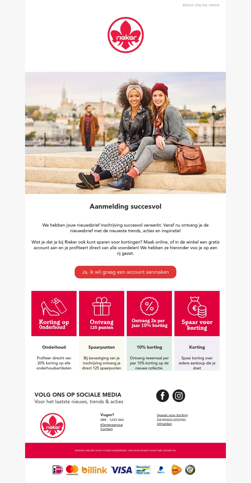 Je aanmelding voor de Rieker nieuwsbrief is succesvol! Maak online of in de winkel een gratis account aan en profiteer van exclusieve kortingen en spaarpunten. Je ontvangt direct 20% korting op onderhoudsartikelen en 125 punten. Volg ons op sociale media voor de laatste trends en acties.