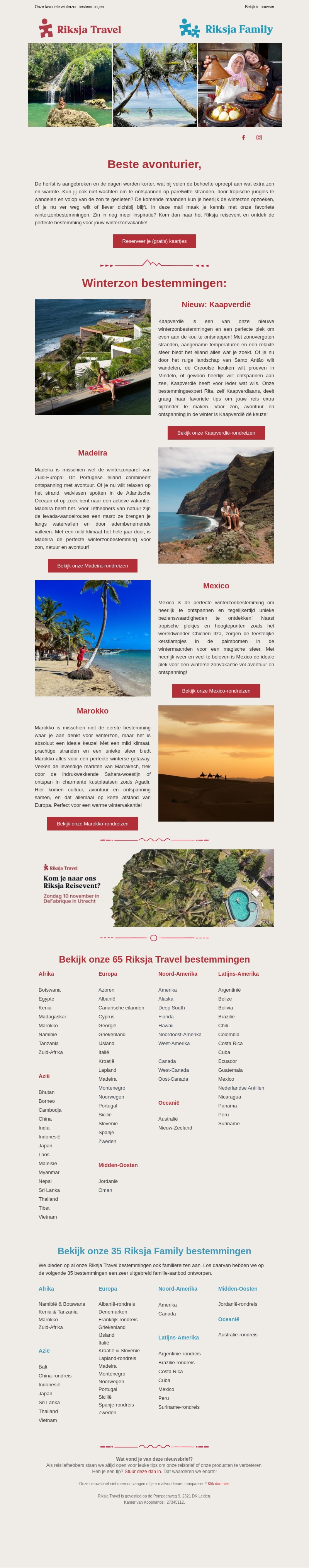 Riksja Travel presenteert een selectie van de beste winterzonbestemmingen. Of je nu de zon wilt opzoeken in Kaapverdië, genieten van de natuur in Madeira, of cultuur wilt ontdekken in Mexico en Marokko, wij zorgen voor onvergetelijke ervaringen. Ontdek onze 35 familie-vriendelijke bestemmingen, ideaal voor avontuurlijke reizigers.