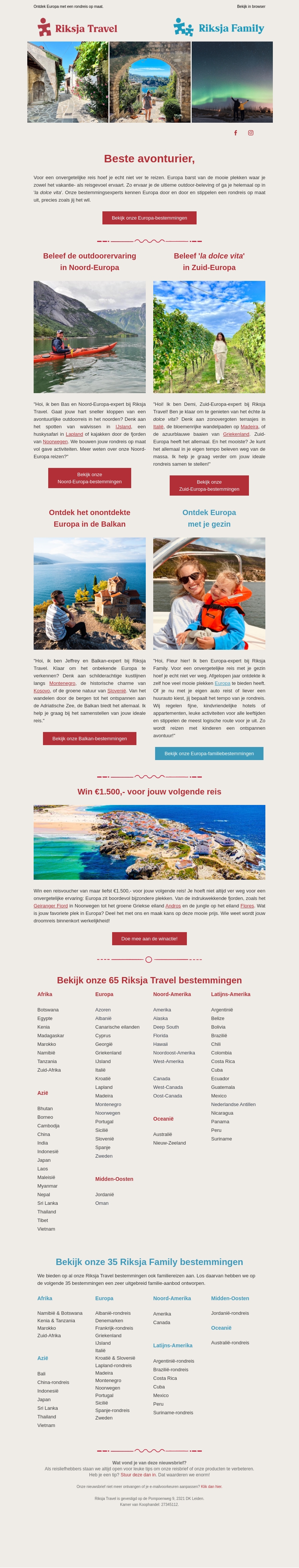 Verken de verborgen parels van Europa met Riksja Travel. Reis van de ruige Scandinavische natuur naar de zonnige wijngaarden van Zuid-Europa. Of neem je gezin mee op een onvergetelijke reis langs prachtige Europese bestemmingen. Nu met de kans om €1.500 te winnen voor je volgende avontuur!