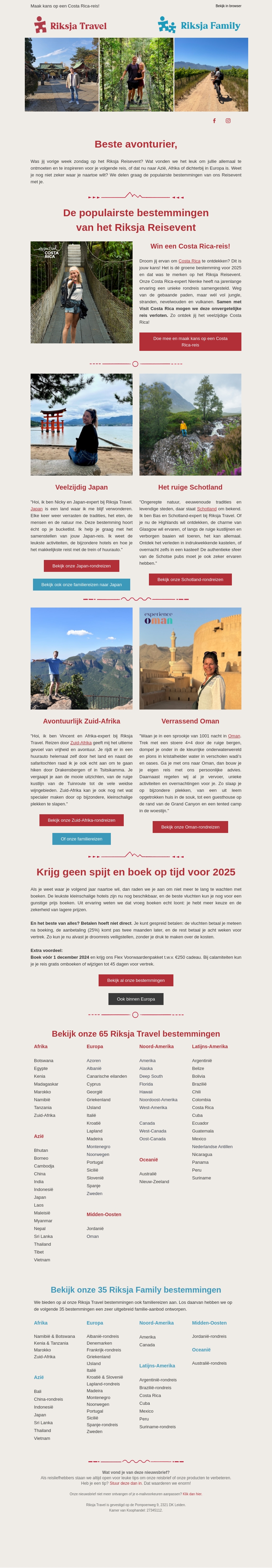 De nieuwsbrief van Riksja Travel biedt een spannende top 5 van reisbestemmingen om te verkennen. Ontdek avontuurlijke bestemmingen zoals Japan, Schotland, en Zuid-Afrika. Grijp de kans om een avontuurlijke reis te winnen naar Costa Rica. Mis de kans niet om tijdig uw droomreis voor 2025 te boeken.