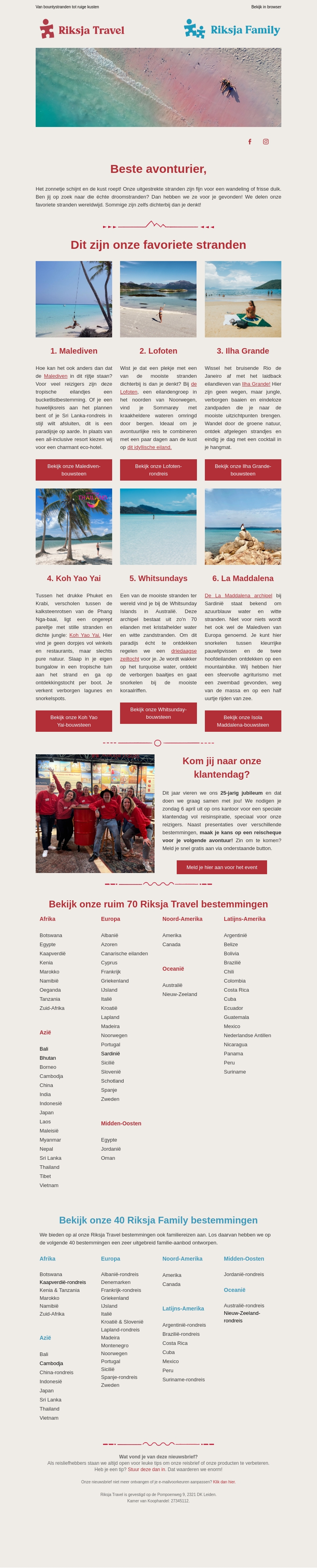 Reis naar de mooiste stranden ter wereld met Riksja Travel. Van de betoverende Malediven tot de schilderachtige Lofoten, ontdek onze topbestemmingen voor zon, zee en zand. Geniet van een paradijselijke vakantie terwijl je ontspant op wit zand en in helderblauw water. Laat je inspireren door onze reisideeën en creëer onvergetelijke herinneringen.