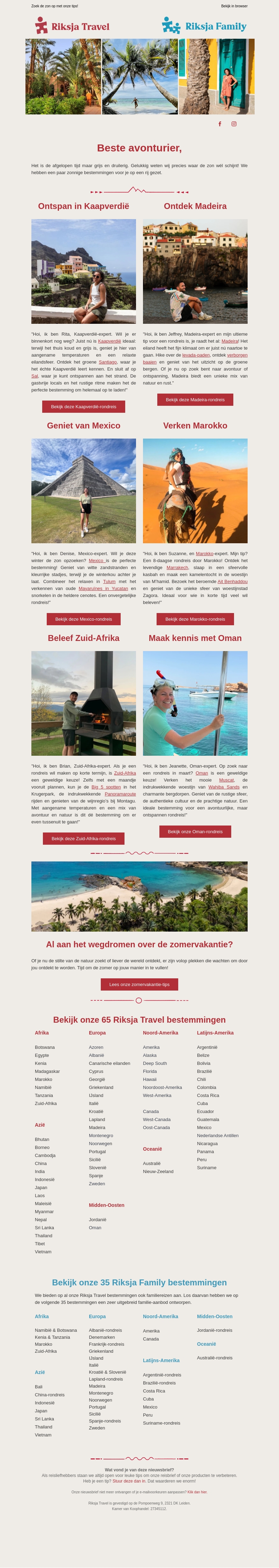 Bereid je voor op zonnige avonturen met Riksja Travel. Ontdek de prachtige bestemmingen Kaapverdië, Madeira, Mexico, Marokko, Zuid-Afrika en Oman. Of je nu wilt ontspannen op het strand of cultuur wilt opsnuiven, er is voor ieder wat wils. Plan je volgende avontuur vandaag nog!
