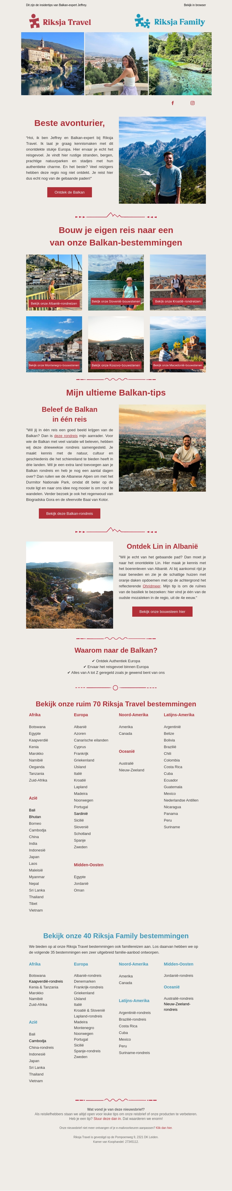 Riksja Travel nodigt avontuurlijke reizigers uit om de prachtige en authentieke regio van de Balkan te ontdekken. Bouw je eigen reis naar diverse Balkan-bestemmingen en geniet van persoonlijke reiservaringen. Ontvang tips van Balkan-experts en verken landen als Albanië en Montenegro. Laat je inspireren door de veelzijdigheid van de Balkan en plan je volgende reis met Riksja.