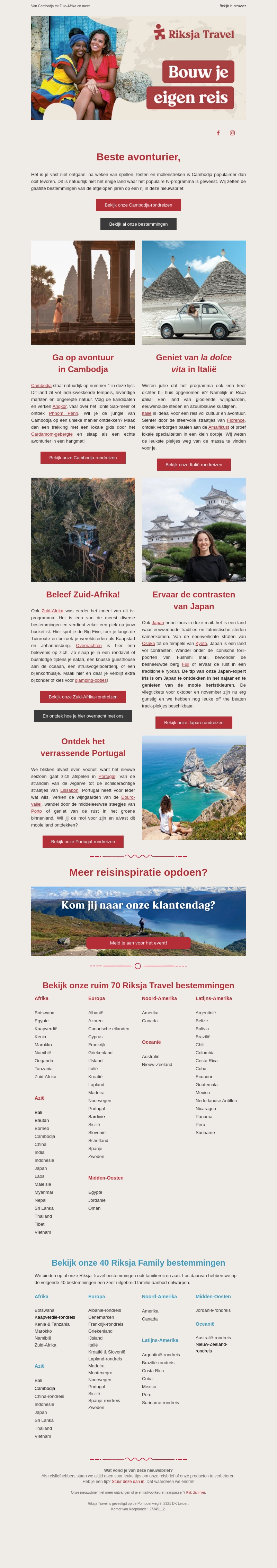 Verken de wereld met Riksja Travel. Ontdek prachtige bestemmingen zoals Cambodja, Italië, Zuid-Afrika, Japan, en Portugal. Geniet van unieke ervaringen en maak onvergetelijke herinneringen. Bekijk onze klantendag voor meer reisinspiratie.